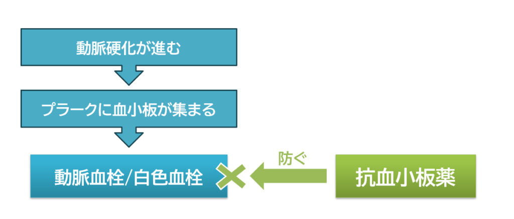 回答の根拠②:「アスピリン」などの抗血小板薬の作用と目的~動脈硬化が原因でできる「動脈血栓/白色血栓」を防ぐ