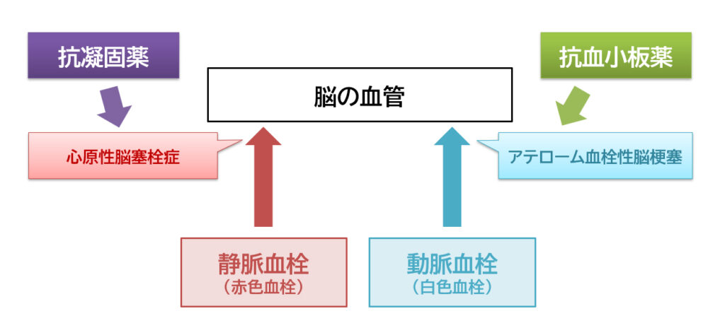 +αの情報:「心原性脳塞栓症」には抗凝固薬、「アテローム血栓性脳梗塞」には抗血小板薬を使う