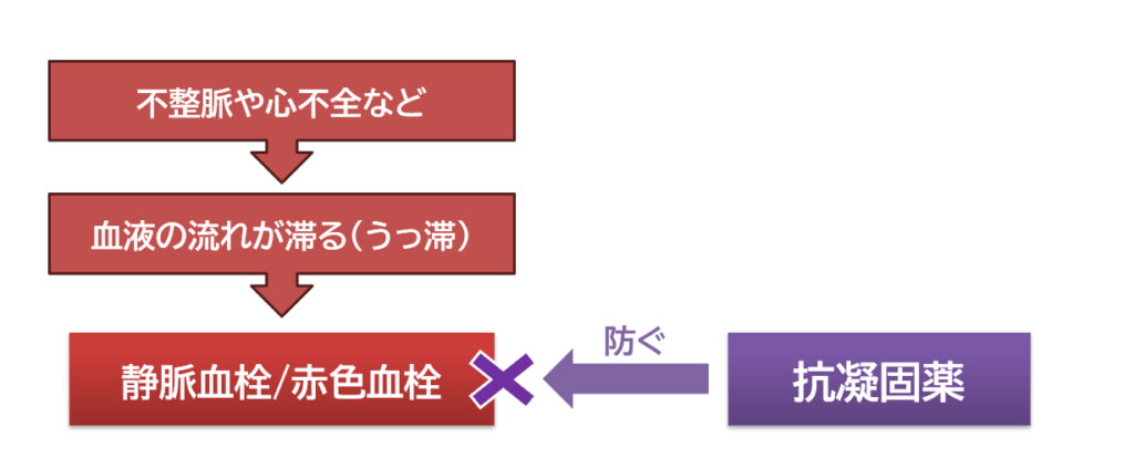 回答の根拠①:「ワルファリン」などの抗凝固薬の作用と目的~血液の流れが滞ってできる「静脈血栓/赤色血栓」を防ぐ