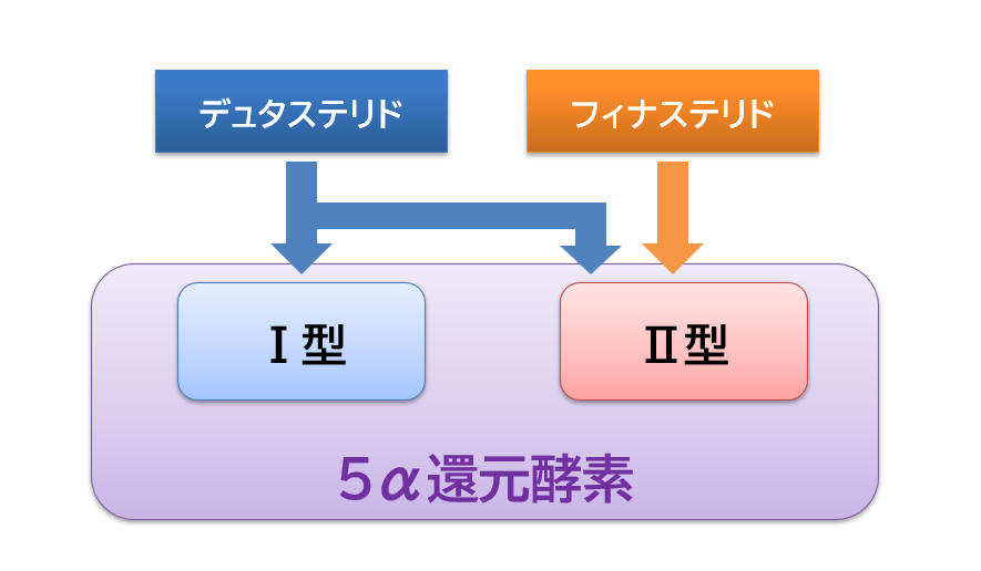 「デュタステリド」は「5α還元酵素」のⅠ型とⅡ型の両方を、「フィナステリド」は「5α還元酵素」のⅡ型を選択的に阻害します4,5)。治療効果の差は、この作用の違いによって生じると考えられています。