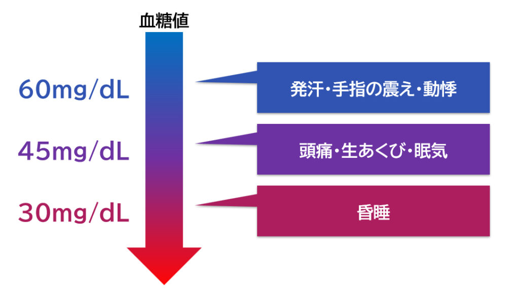 血糖値<60mg/dL:発汗・手指の震え・動悸・頻脈などの交感神経症状