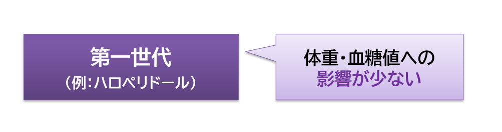 「ハロペリドール」などの「第一世代」の抗精神病薬は、「第二世代」の薬に比べて体重増加や血糖・脂質の値の上昇といった代謝系への影響が少なめです9)。