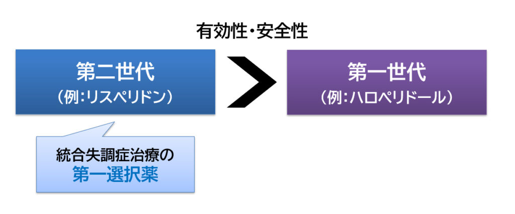 統合失調症は、急性期治療でも再発予防でも、「リスペリドン」などの「第二世代(非定型)」の薬の方が、「第一世代(定型)」の薬よりも効果が高く、さらに錐体外路障害や遅発性ジスキネジアなどの副作用も少ない1,2,3)ことがわかっています。