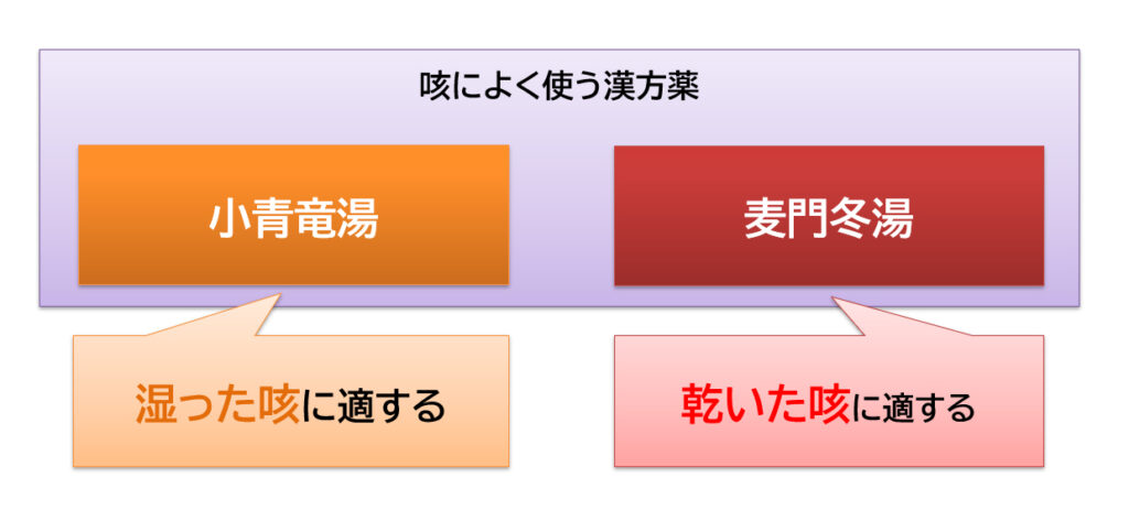 回答:湿った咳に適した「小青竜湯」、乾いた咳に適した「麦門冬湯」