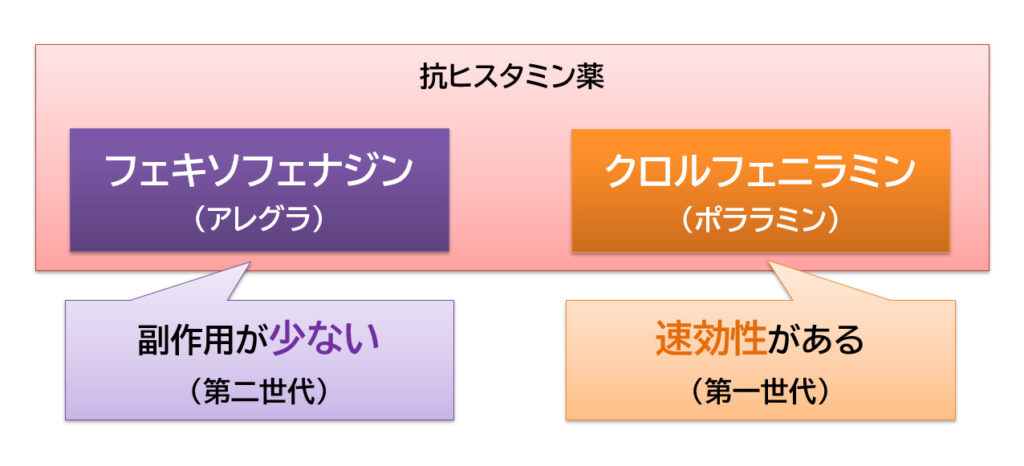 【薬剤師が執筆・監修】速効性に優れた第一世代の「クロルフェニラミン」と、眠気や口渇の副作用が少なく前立腺肥大や緑内障に対するリスクも小さい第二世代の「フェキソフ…